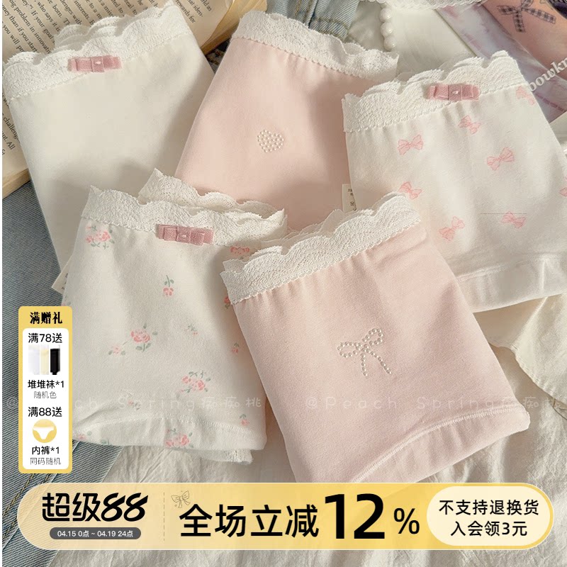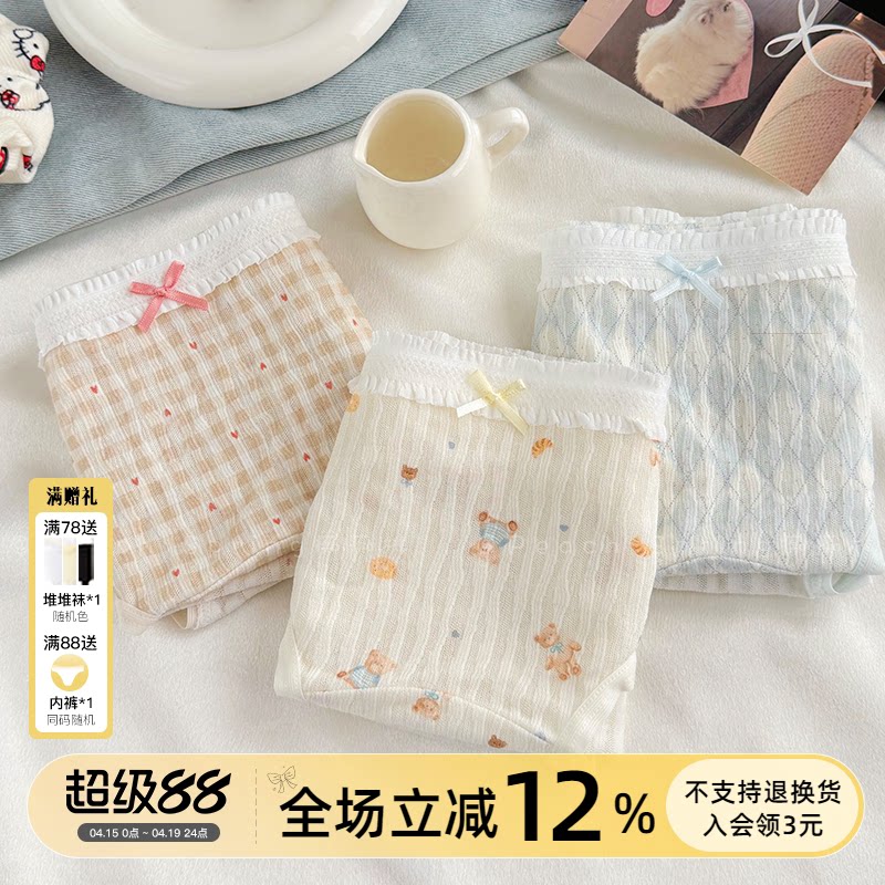 樱花漫步~纯棉加长裆内裤甜美有大码胖mm10A抗菌少女中腰包臀三角