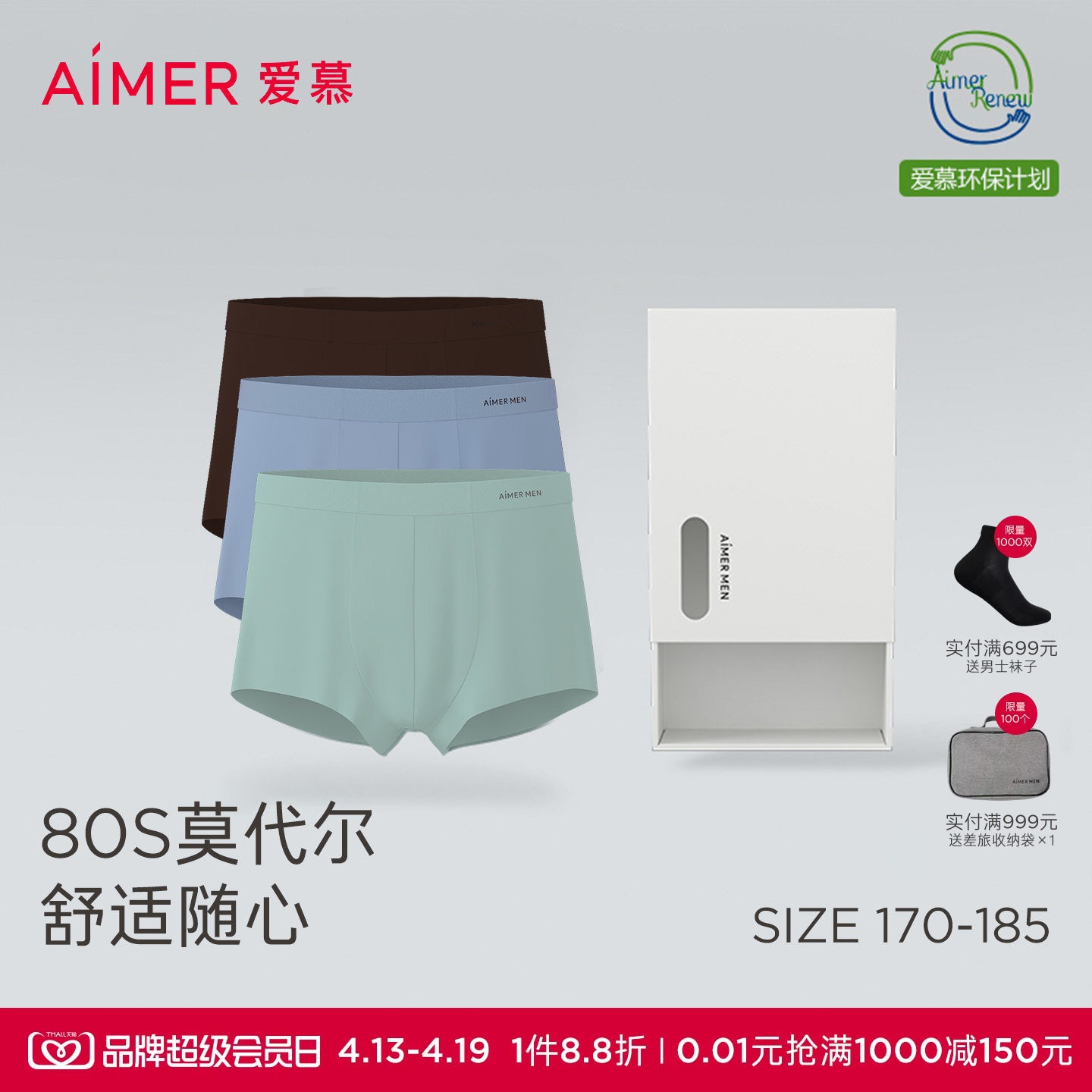 【3条装】爱慕先生HELLO裤大空间莫代尔抗菌男士内裤平角裤春夏