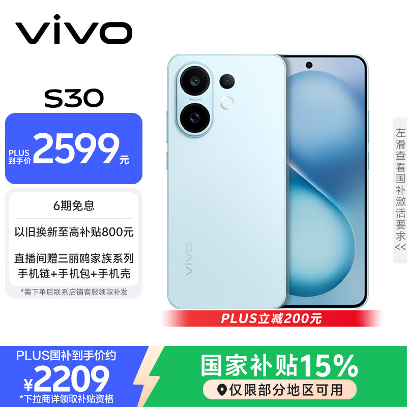 vivo S30 12GB+512GB 薄荷青 国家补贴 多彩轻薄直屏 超级潜望长焦 学生 live图 AI手机