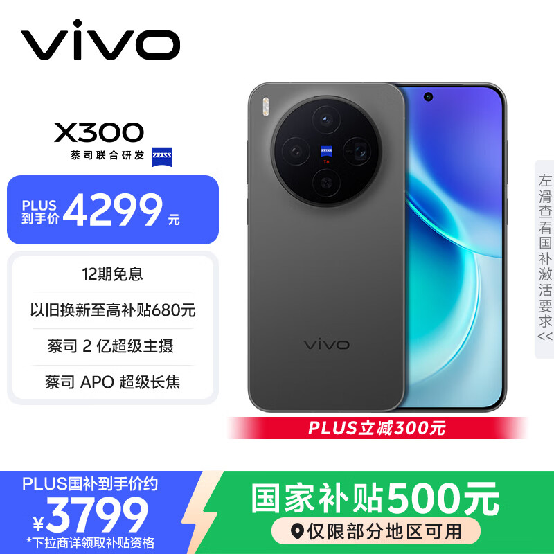 vivo X300 12GB+256GB 纯粹黑 蔡司2亿超级主摄 蔡司APO超级长焦 5年持久流畅OriginOS 6 拍照 AI手机