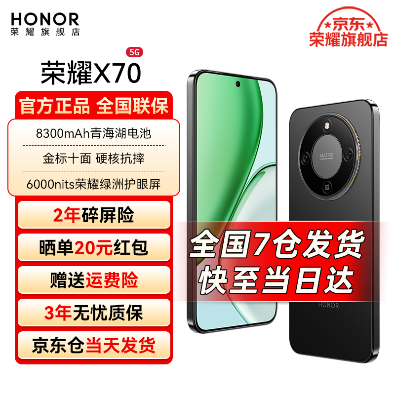 荣耀X70 手机荣耀新品5G手机 金标十面抗摔 IP69防水 8300mAh青海湖电池 幻夜黑 12GB+512GB【2年碎屏险】 官方标配