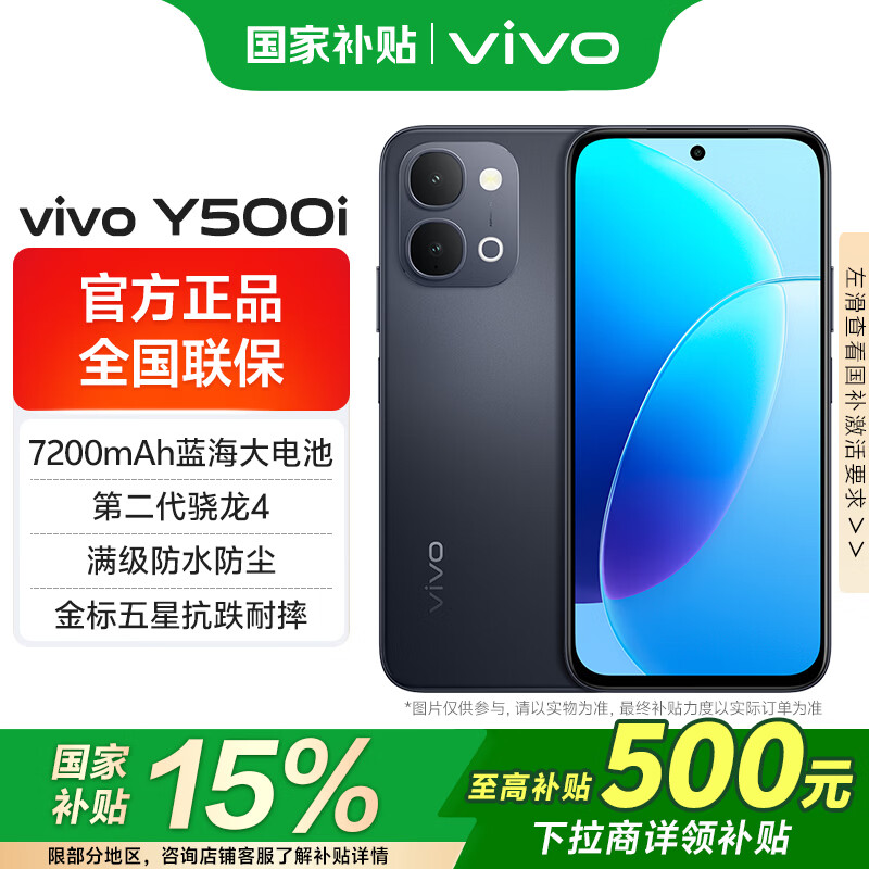 vivo Y500i国家补贴 满级防水防尘 全面抗摔 7200mAh大电池 第二代骁龙4 新品5G手机 曜石黑 8GB 256GB 官方标配版