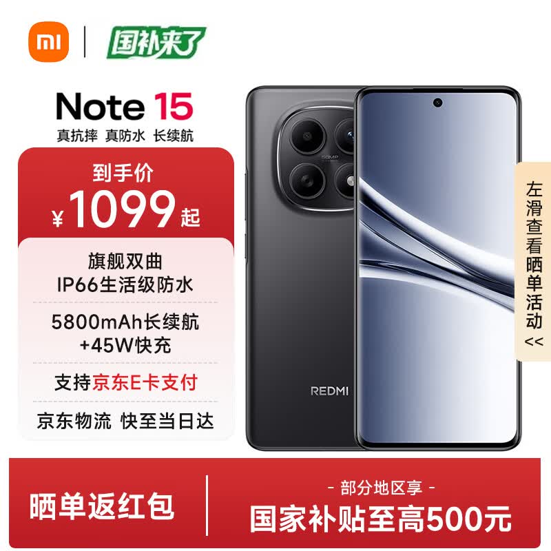 小米红米Note15【国家补贴】 新品5G小米红米手机 第三代骁龙6 金刚品质 5800mAh大电量 IP66防尘防水 子夜黑 8GB+128GB