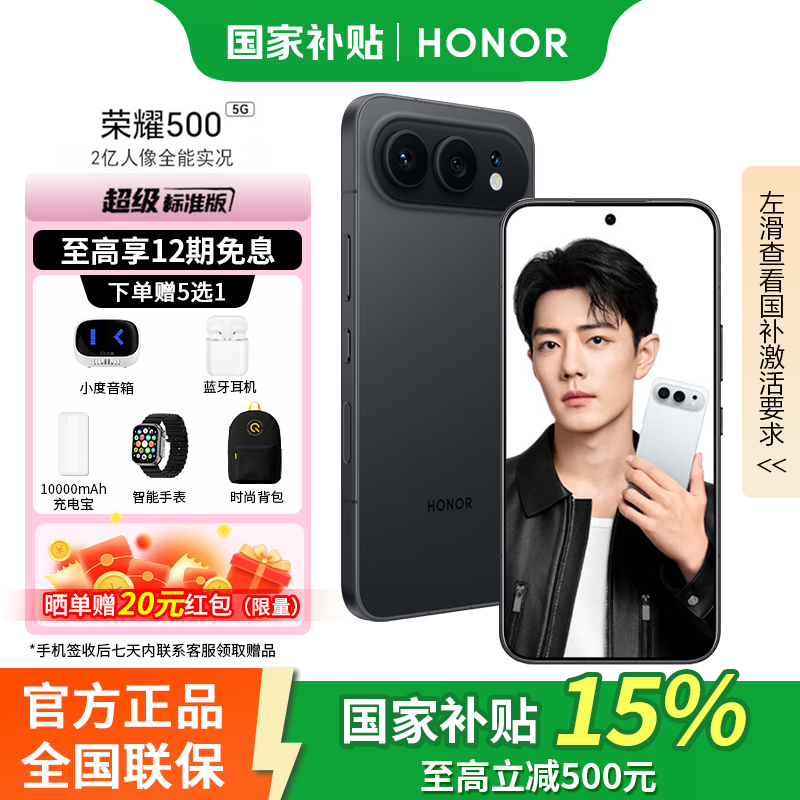 荣耀500 新品5G手机 超级标准版 【肖战同款】2亿人像全能实况 曜石黑 12GB+256GB 官方标配【焕新版】