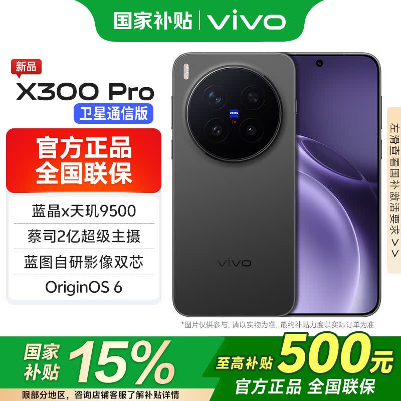 vivoX300 Pro卫星通信版 国家补贴 新品5G旗舰手机 蔡司2亿超级主摄APO超级长焦5年流畅AI手机办公拍照 纯粹黑 16GB 512GB 官方标配版