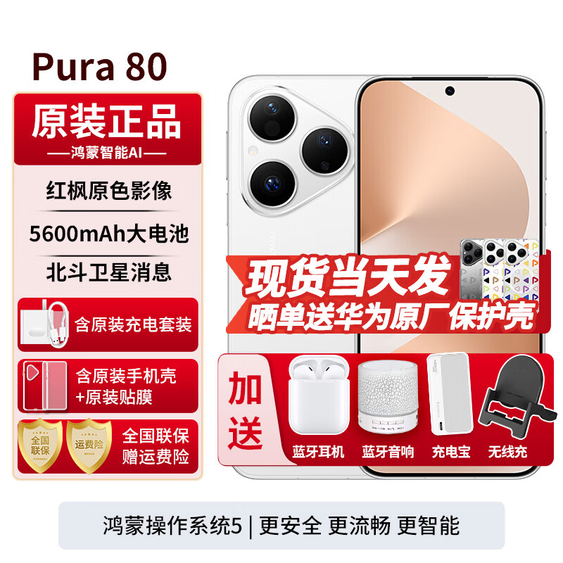 华为pura80【24期免息】新品旗舰手机华为p80 丝绒直屏 红枫原色影像 全新鸿蒙AI 新机2025年上市 丝绒白 12G+256G全网通 官方标配
