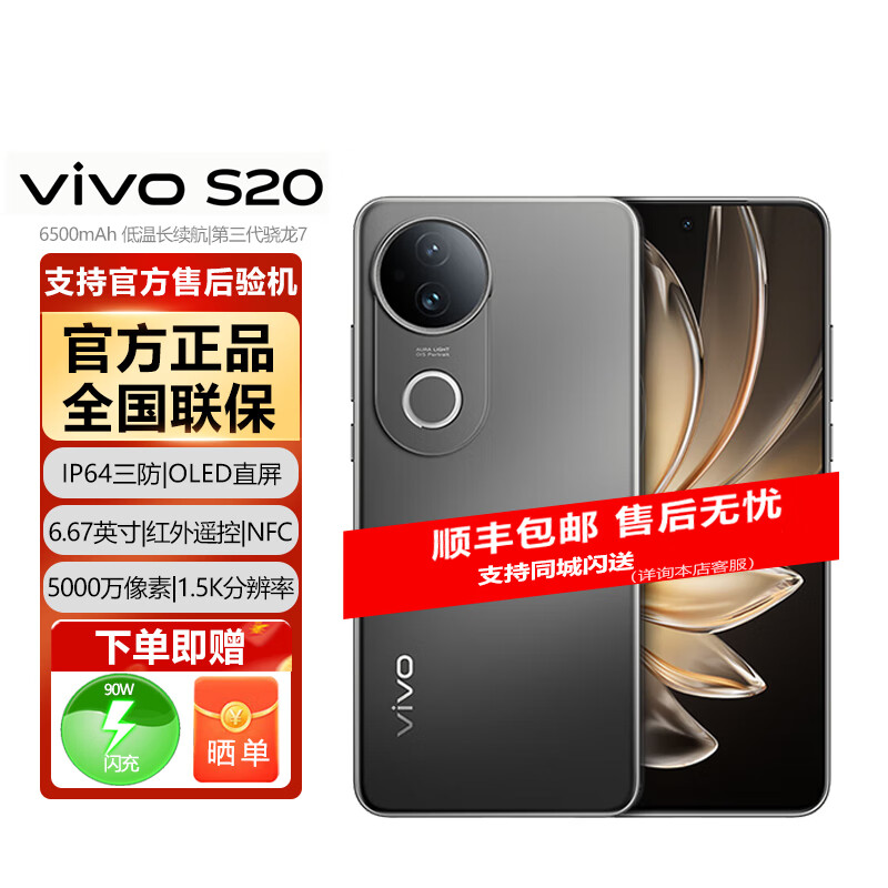 vivo S20 6500mAh 低温长续航【分期免息白条可选】京东方Q10悦目护眼屏5000万防畸变柔光自拍AI手机 松烟墨 16GB+512GB 标配+24期|免息