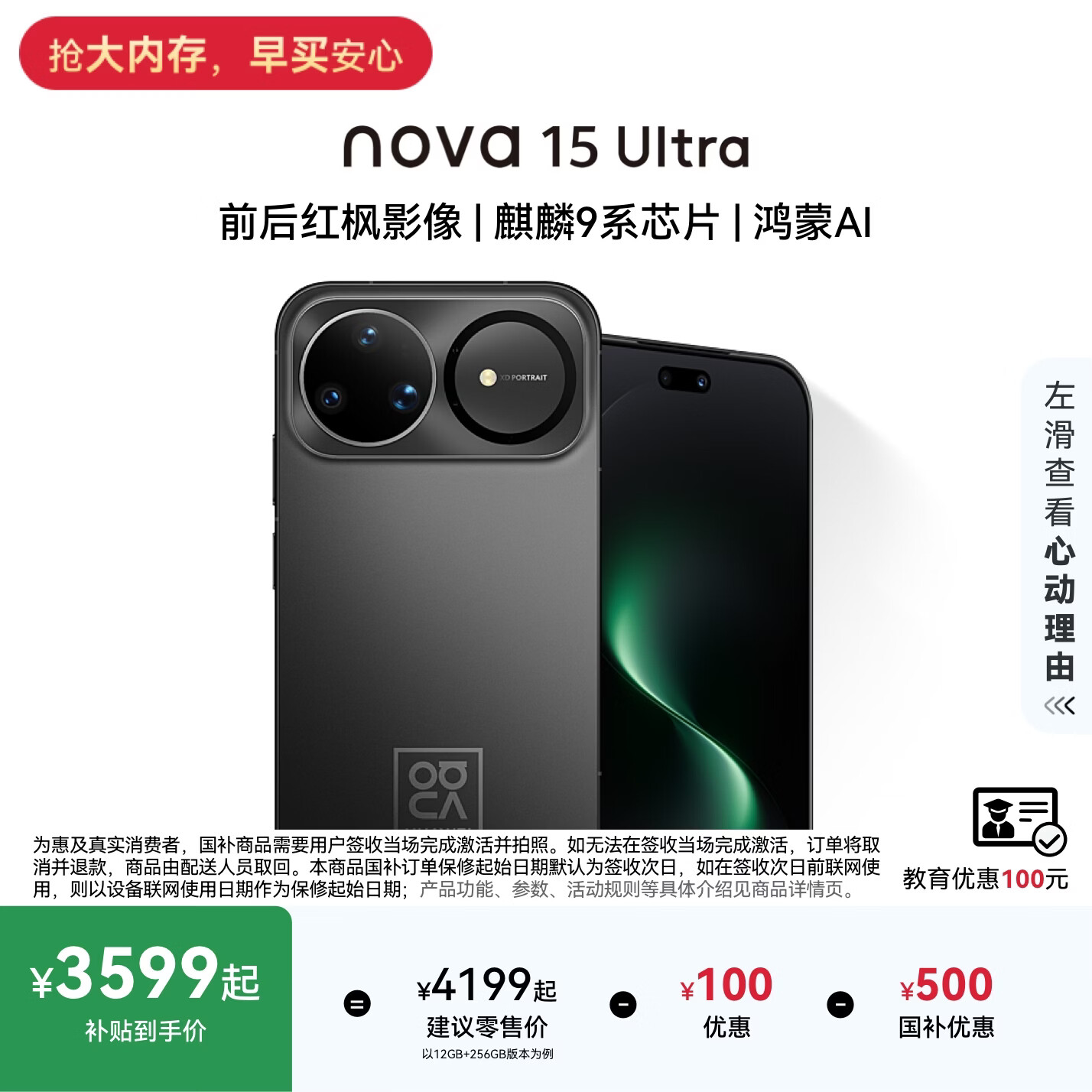 华为nova 15 Ultra 麒麟9系芯片前后红枫影像6.8mm超薄机身天通北斗双卫星华为手机 幻夜黑 512GB 昆仑玻璃