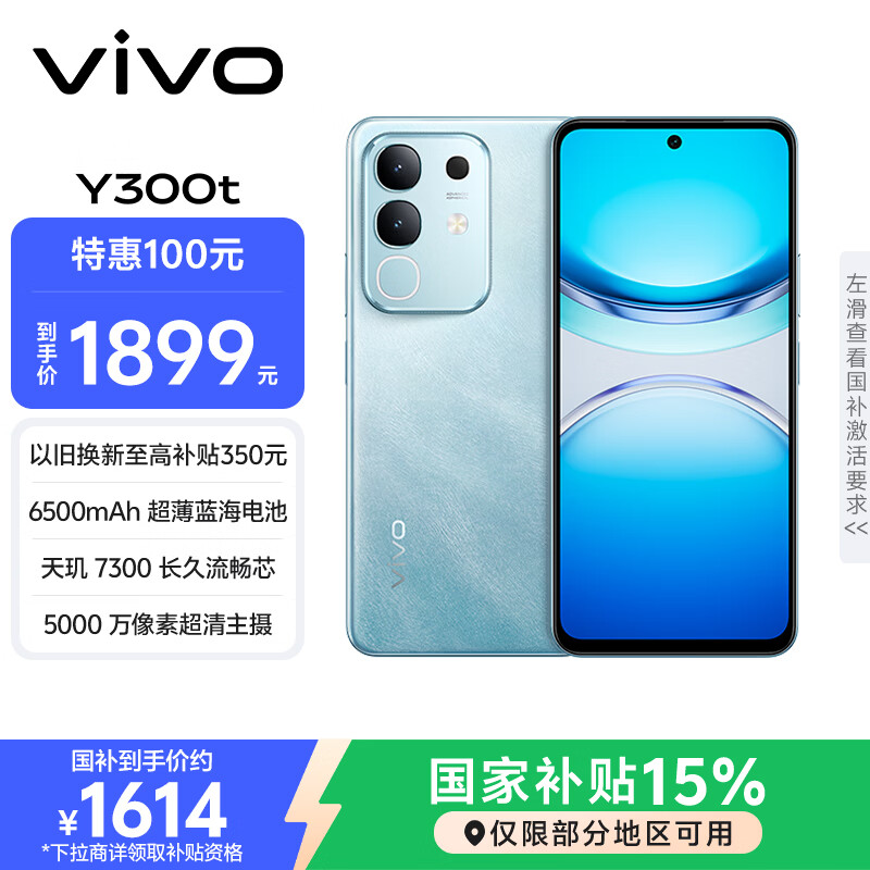 vivo Y300t 12GB+512GB 海蓝 国家补贴 6500mAh超薄蓝海电池 天玑7300长久流畅芯 全功能NFC AI手机