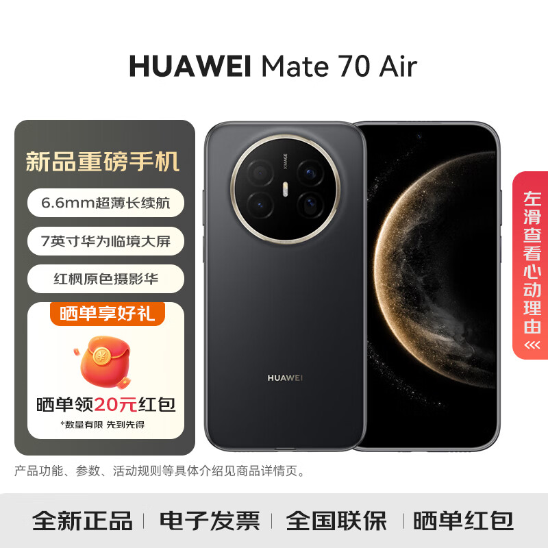 华为(HUAWEI)Mate 70 Air 6.6mm超薄长续航7英寸华为临境大屏红枫原色摄影华为手机 曜金黑 16GB+256GB