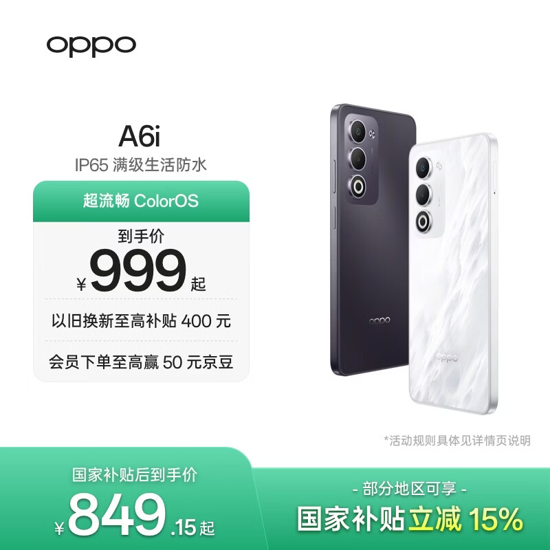 OPPO A6i 5G 手机 IP65 满级生活防水 超抗摔金刚石架构 6000mAh 五年耐用大电池 手机 国家补贴 云雾白 8GB+256GB