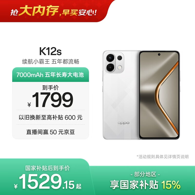 OPPO K12s 12GB+512GB 星芒白 7000mAh长续航大电池 OLED 直屏 骁龙学生 5G游戏千元新款手机 国家补贴