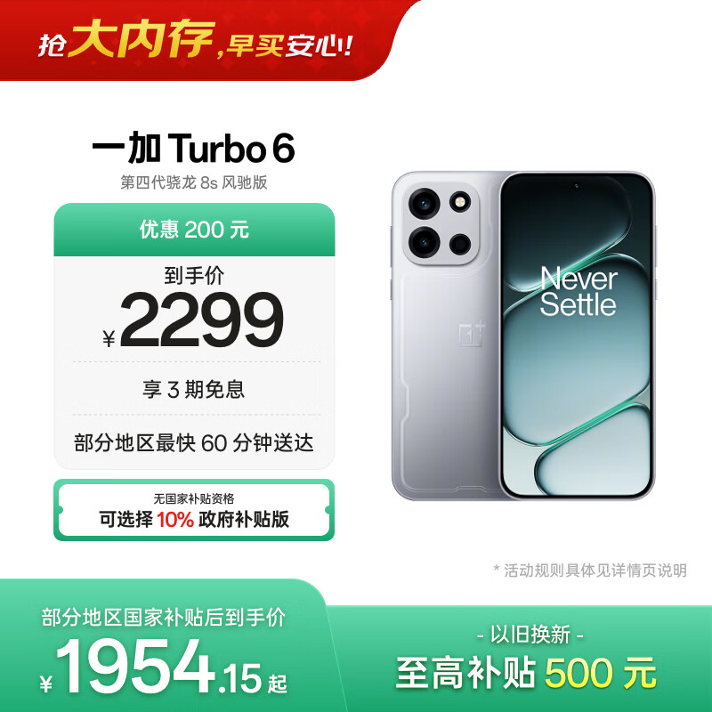 一加 Turbo 6 12GB+256GB 追光银 oppo 9000mAh冰川电池 165Hz高刷东方屏 智能游戏电竞手机 国家补贴