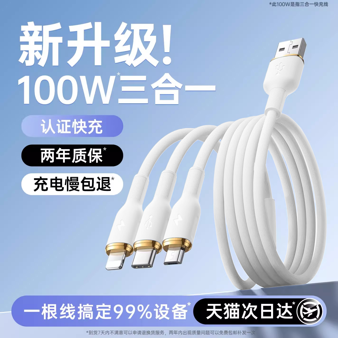 第一卫适用数据线三合一充电器线液态100W超级快充三头苹果华为vivo安卓一拖三Typec手机iPhone多头多功能充