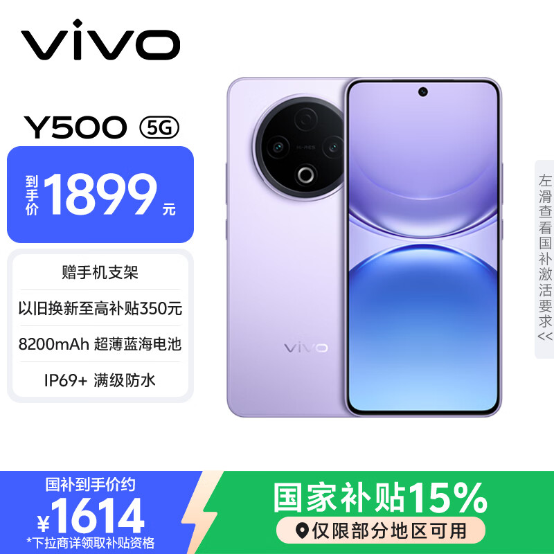 vivo Y500 8GB+256GB 龙晶紫 8200mAh超薄蓝海电池 IP69+满级防水 越级旗舰外观 耐用抗摔 AI手机