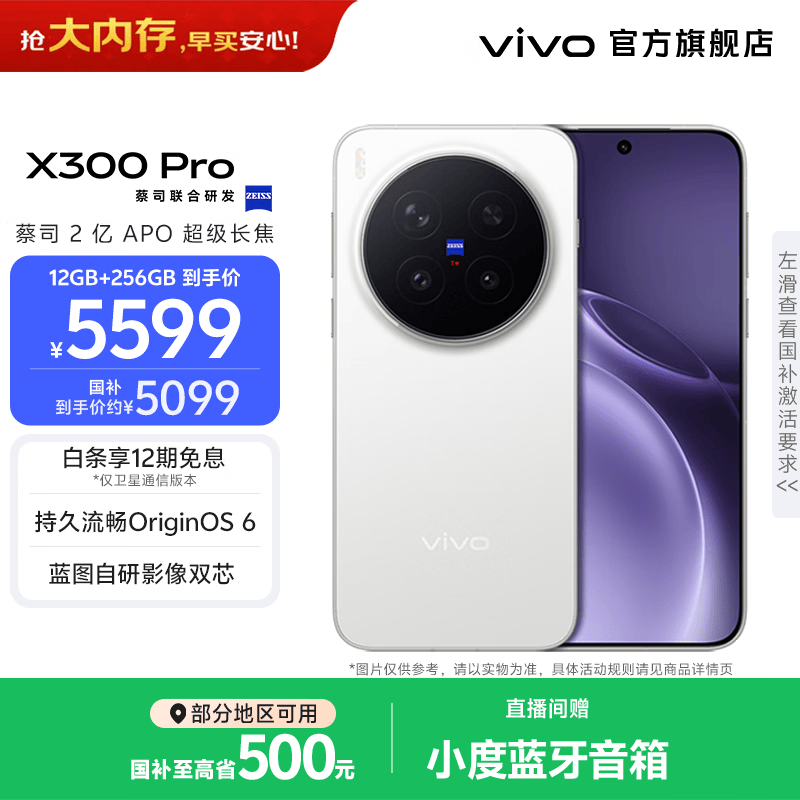 vivoX300 Pro国家补贴 5G旗舰手机 蔡司2亿超级主摄APO超级长焦5年持久流畅AI手机办公拍照 简单白 16GB 512GB 官方标配版