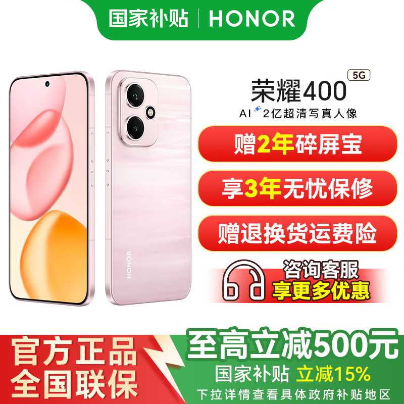 荣耀400 【国家补贴】新品5G手机 2亿超清写真人像 7200mAh青海湖大电池 手机荣耀 流沙粉 12G+256G 官方标配