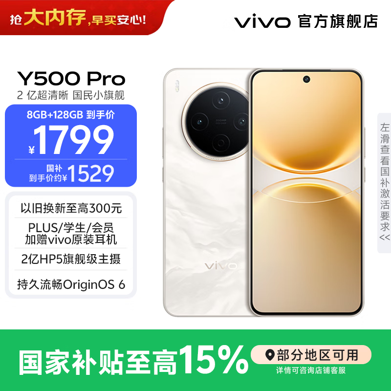 vivo Y500 Pro 2亿HP5旗舰级主摄 持久流畅OriginOS 6 十倍时长IP68+IP69防水 国家补贴 新品手机 祥云金 8GB+256GB 官方标配