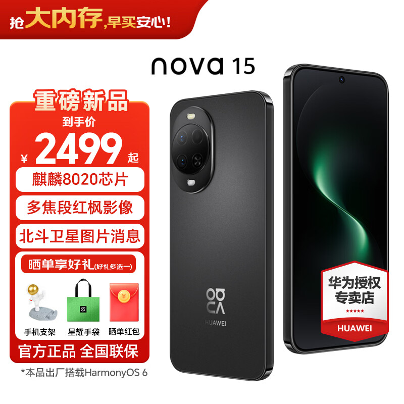华为(HUAWEI)nova 15 华为手机新品上市 麒麟8020芯片 多焦段红枫影像 鸿蒙AI 臻彩OLED直屏鸿蒙智能手机 幻夜黑 12GB+256GB 官方标配