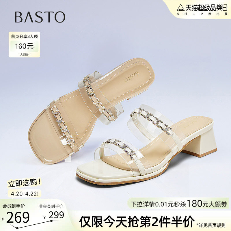 百思图夏季商场新款时尚一字拖凉拖粗跟外穿女拖鞋W3671BT5