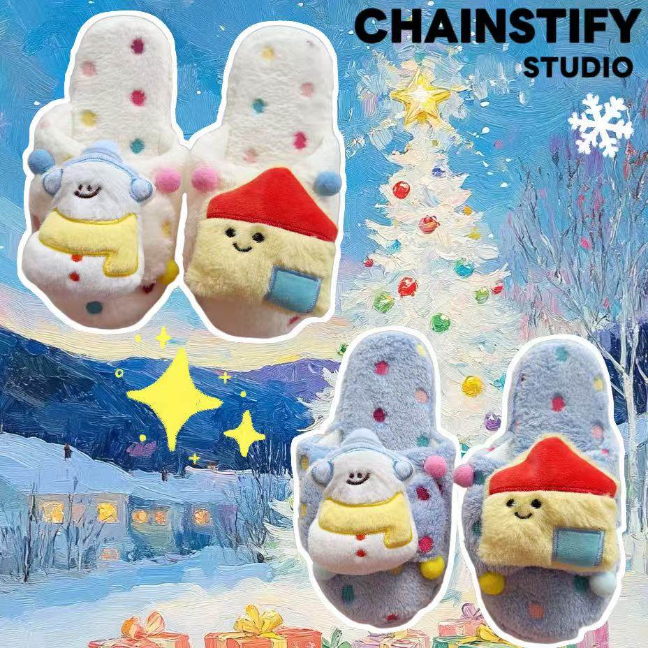 可爱卡通圣诞节雪人房子波点毛绒居家拖鞋秋冬保暖学生宿舍室内拖