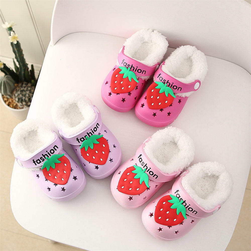 草莓秋冬季可拆卸儿童洞洞鞋加绒中童室内卡通棉拖鞋小女童
