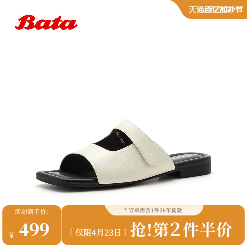 Bata一字拖女2026夏季商场新款时尚外穿方头羊皮休闲拖鞋6B351BT6