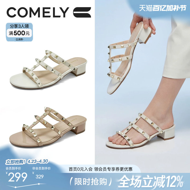 康莉时尚铆钉粗跟拖鞋女款外穿夏季新款真皮时尚百搭凉拖鞋配裙子