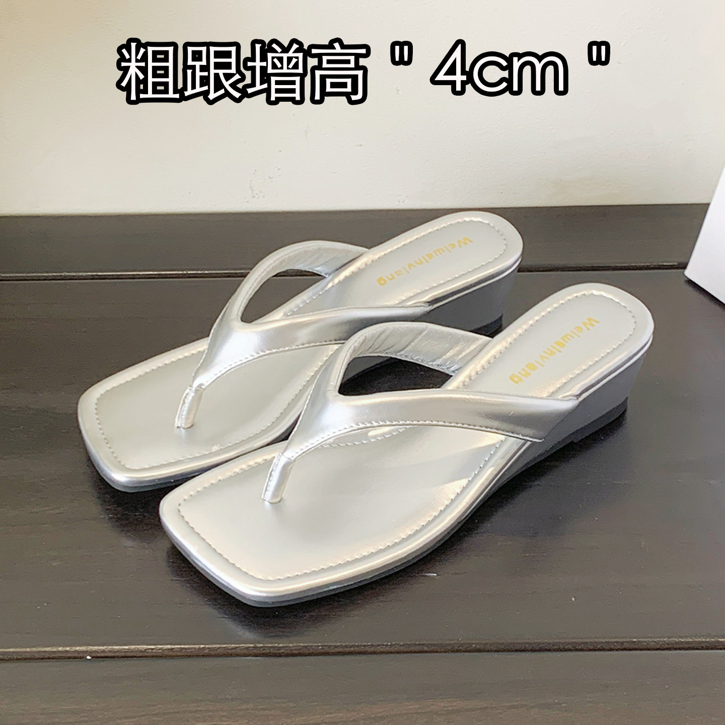 羊皮~银色坡跟人字拖鞋女夏季新款外穿夹趾厚底增高凉拖鞋凉大码
