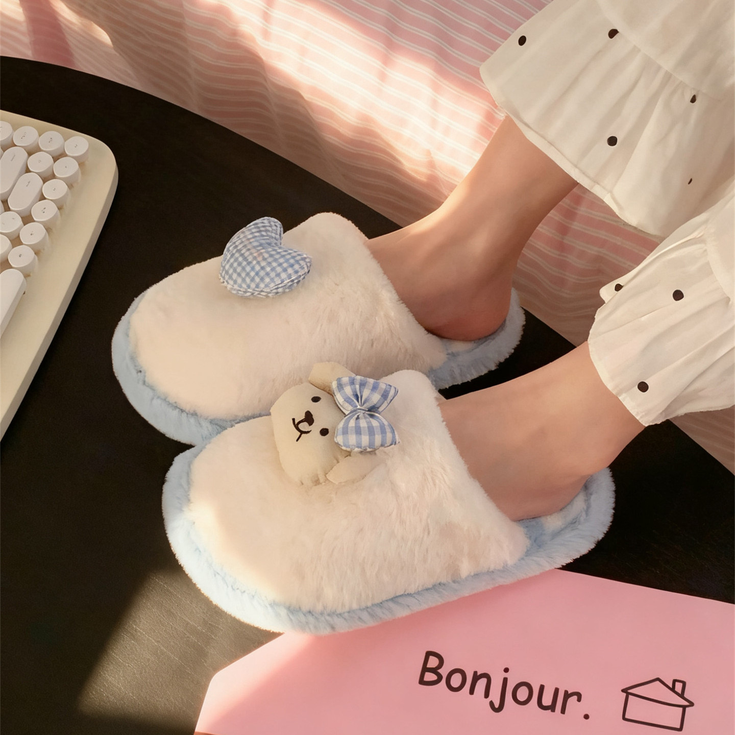 居家冬韩系蝴蝶结小熊学生卧室毛毛鞋女士舒适防滑可爱撞色棉拖鞋