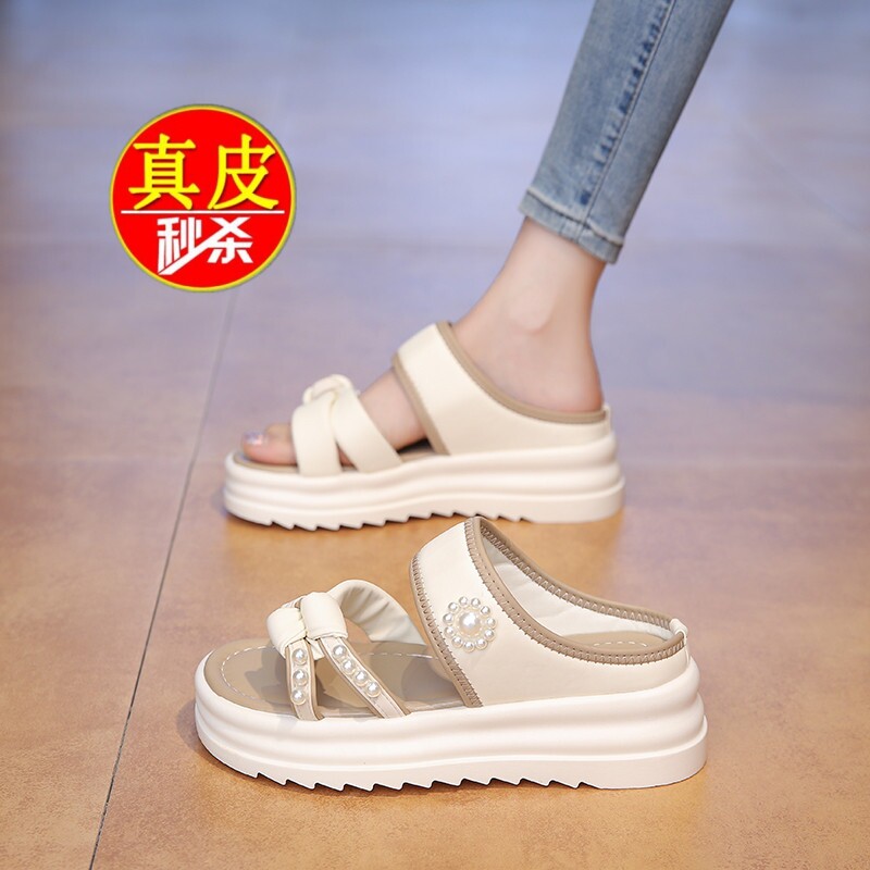 品牌真皮踩屎感软底凉拖鞋女2026夏季新款外穿珍珠配裙子百搭凉鞋