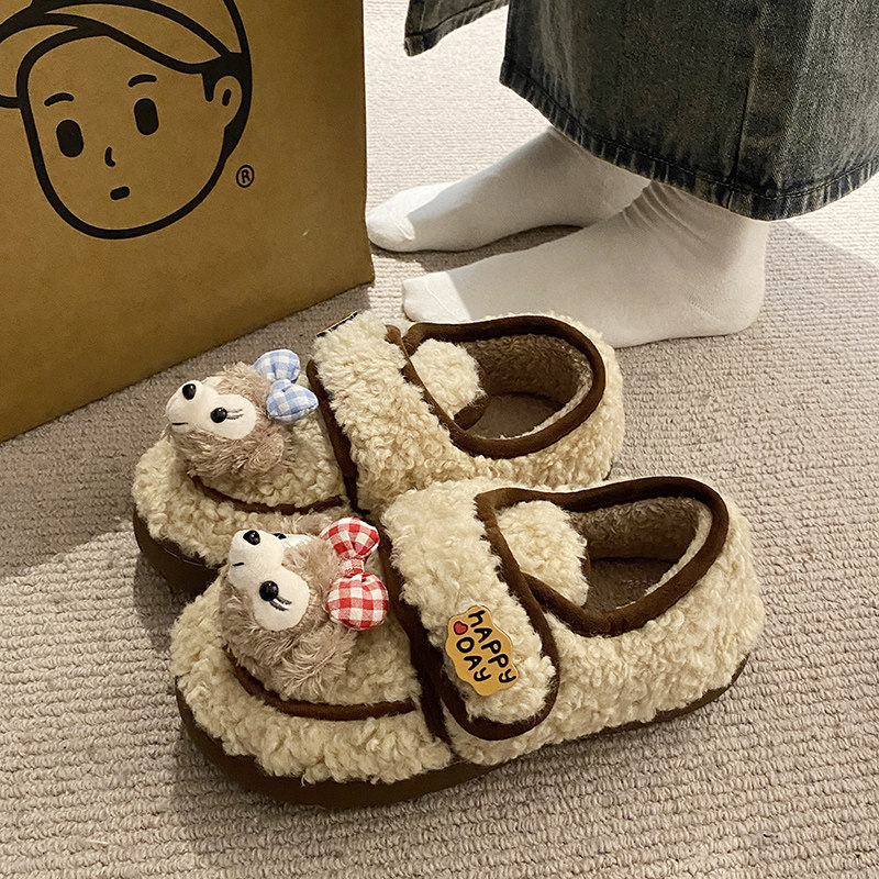 水星家纺棉拖鞋女冬包头蝴蝶结毛绒厚底增高防滑保暖居家懒人鞋