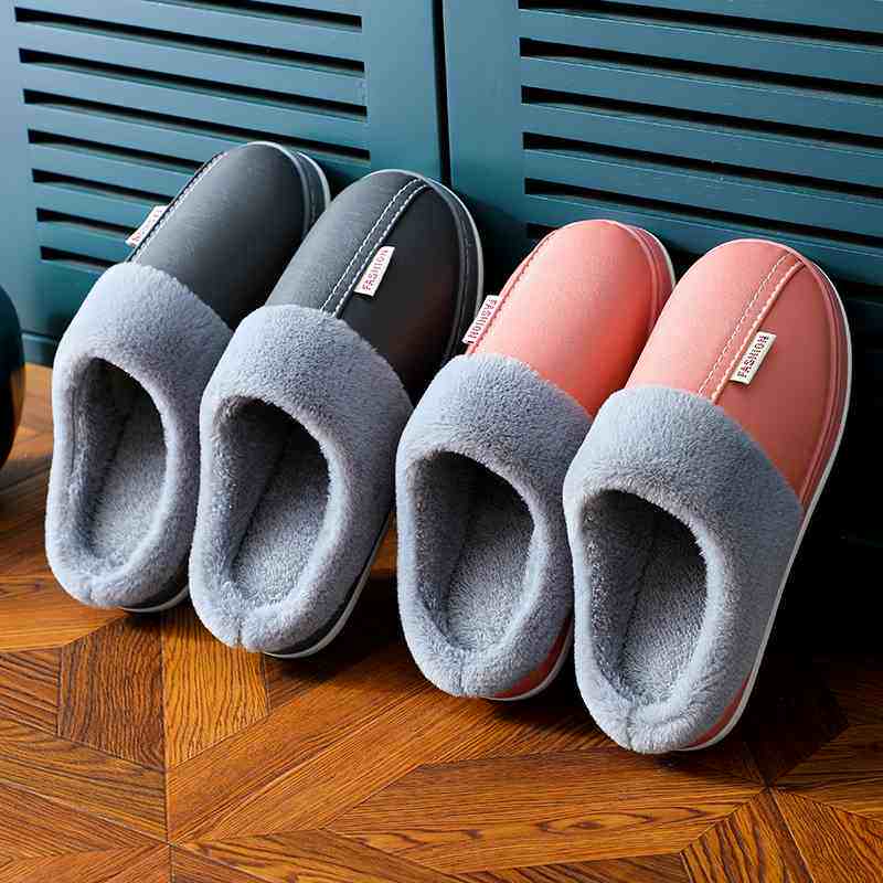 棉拖鞋女秋冬季室内家居用棉鞋防水PU皮保暖厚底包跟情侣男士家用