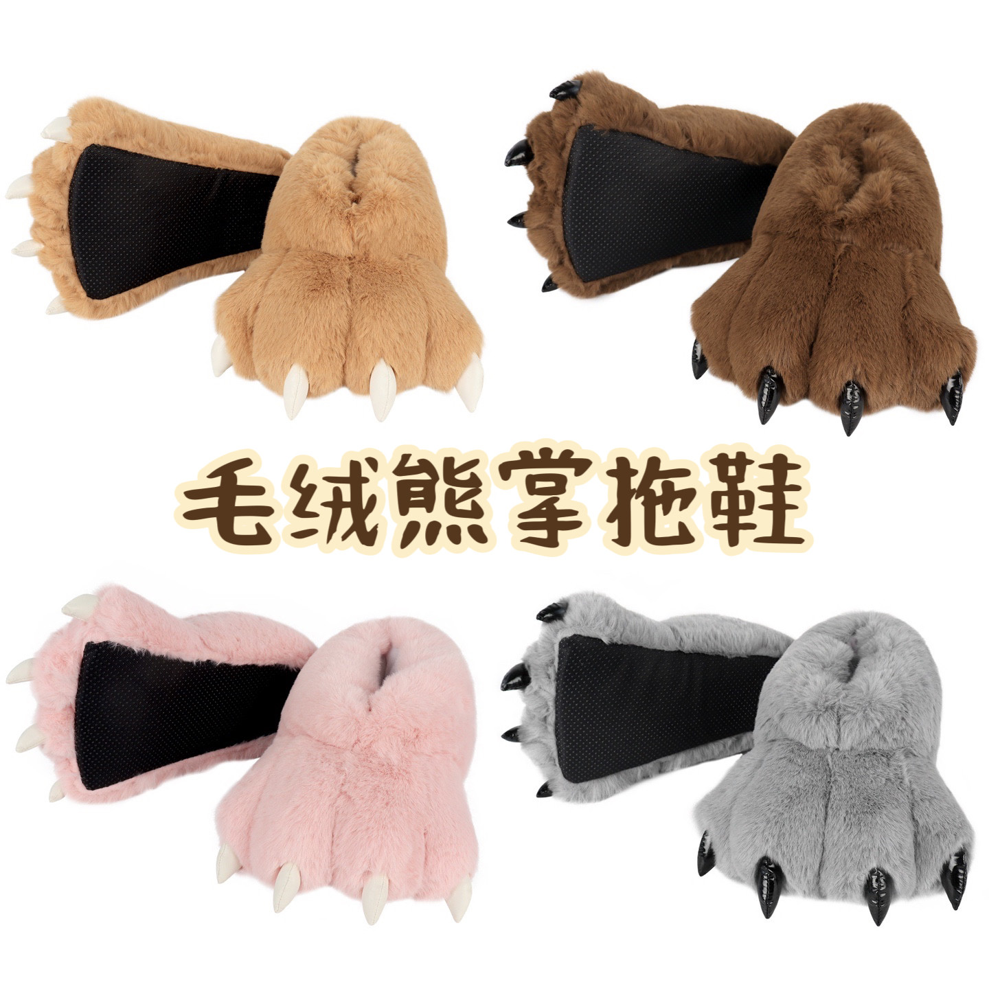 秋冬毛绒熊爪保暖拖鞋熊掌室内兽爪卡通情侣搞怪动物居家毛拖鞋