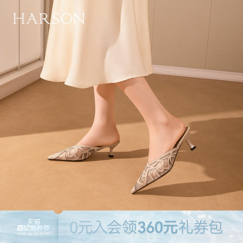 哈森时尚网纱镂空高跟鞋尖头细跟包头时装拖鞋2026新款HWM260110