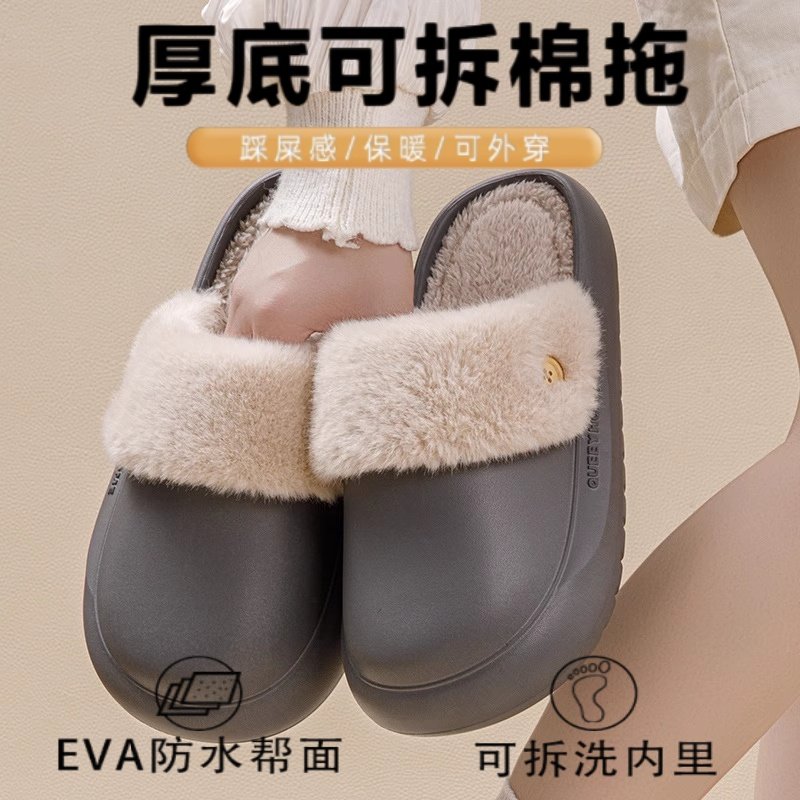 可拆卸防水棉拖鞋女冬季室内家居厚底防滑加绒保暖踩屎感棉拖鞋男