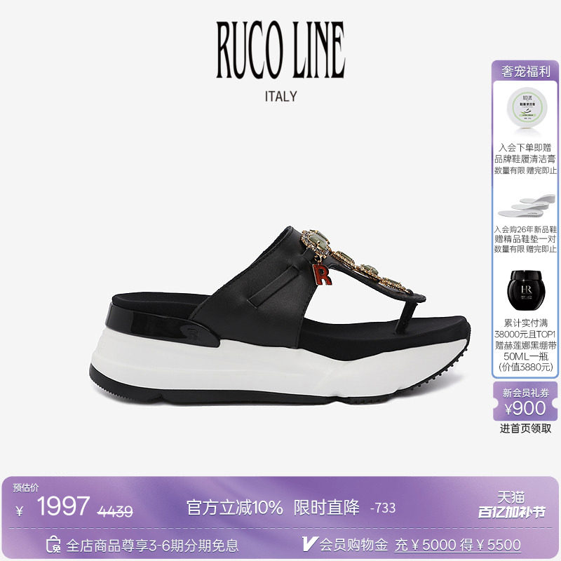 Ruco Line如卡莱奢华牛皮凉鞋厚底水钻人字拖女夹脚拖鞋6cm增高鞋