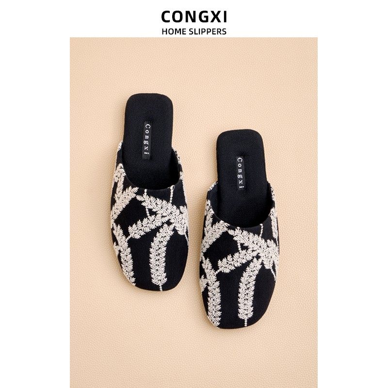 -原创设计 秋冬款黑色棉麻拖鞋 舒适透气居家拖鞋 牛筋防滑底外穿