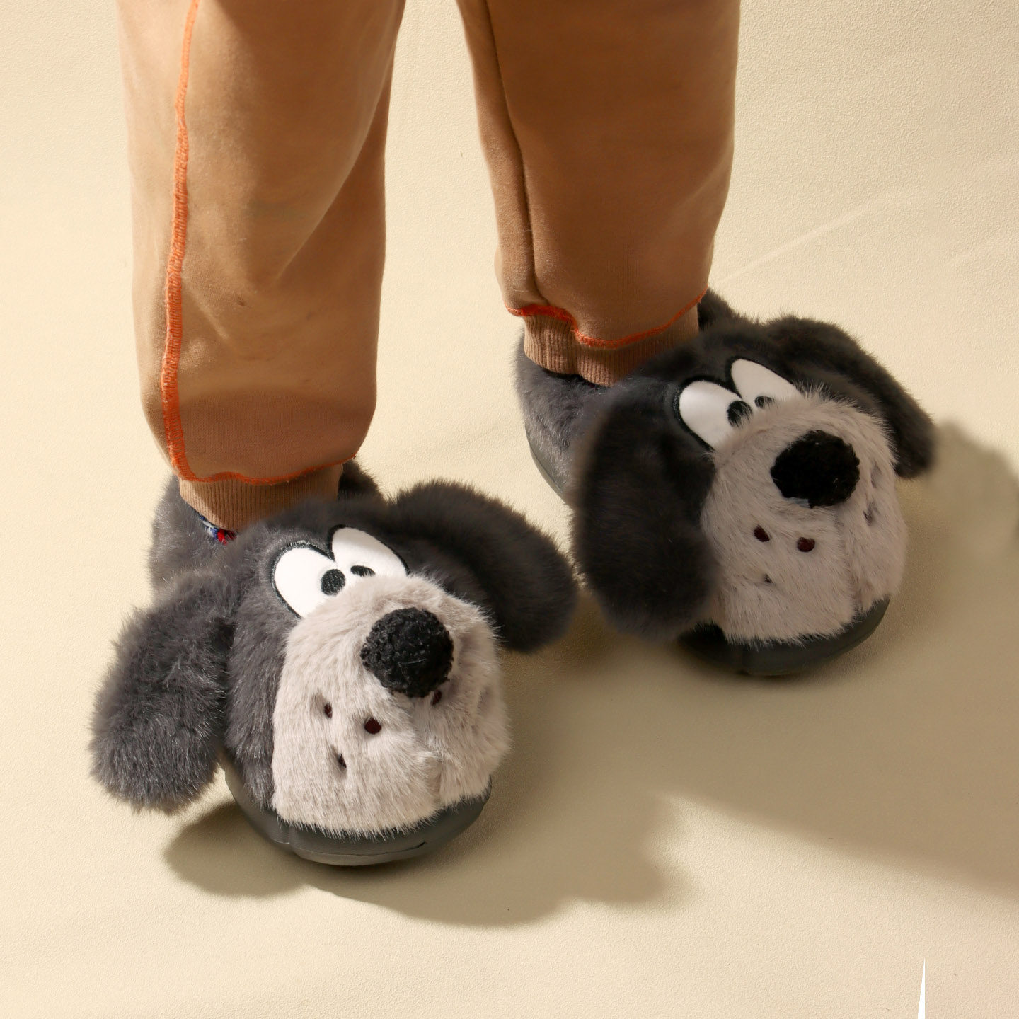 新款亲子儿童包跟棉拖鞋可爱卡通小狗女男款厚底防滑保暖毛绒棉靴
