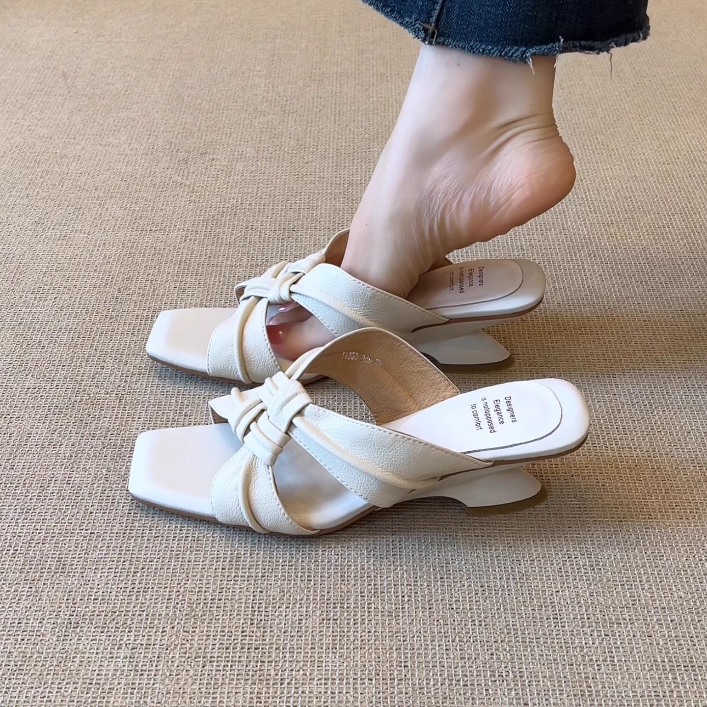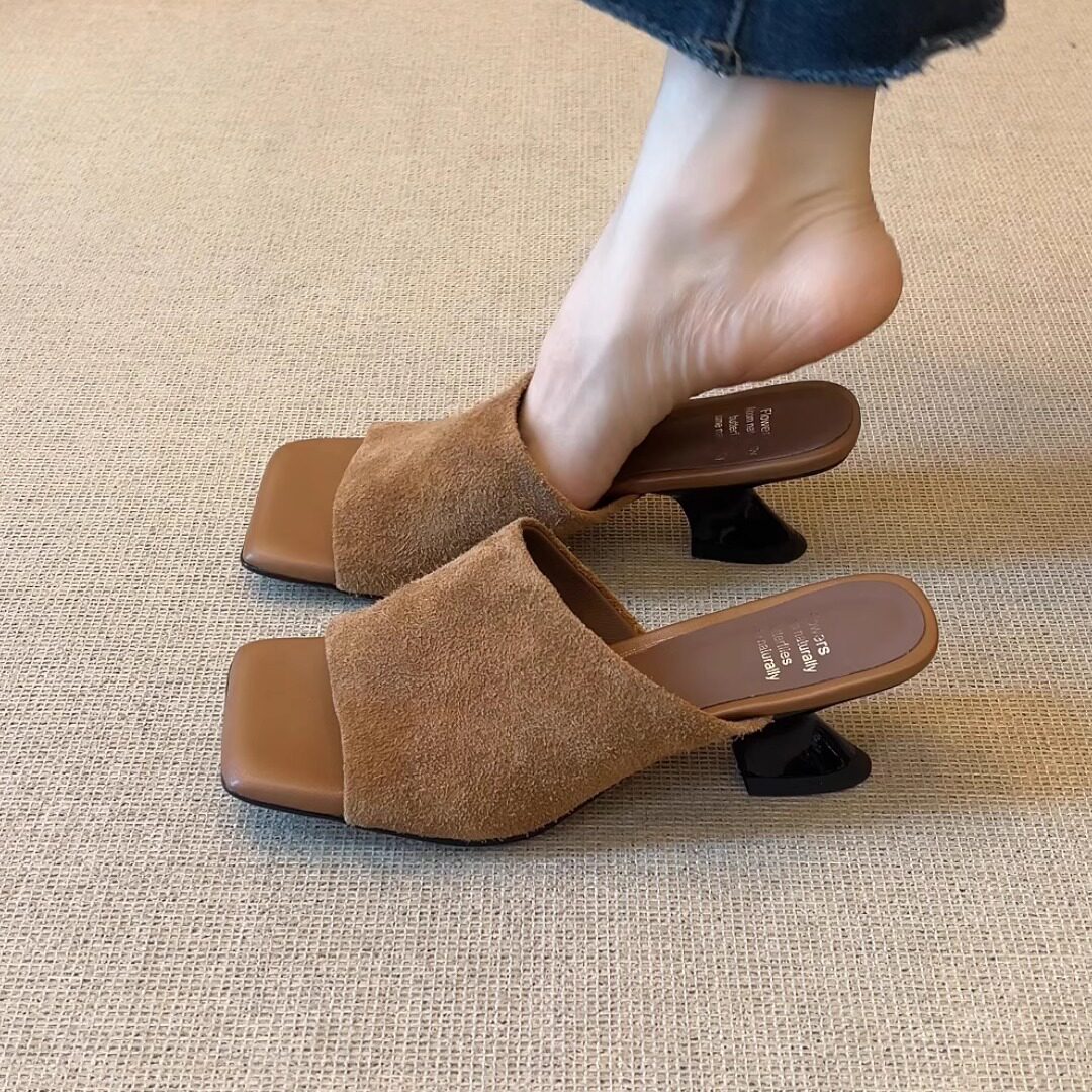 nnmiss/5.5cm复古气质百搭方头露趾简约异形跟一字带外穿凉拖鞋