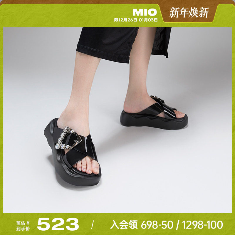 MIO米奥夏季中跟时尚拖鞋金属饰扣波浪底前卫个性一字拖女