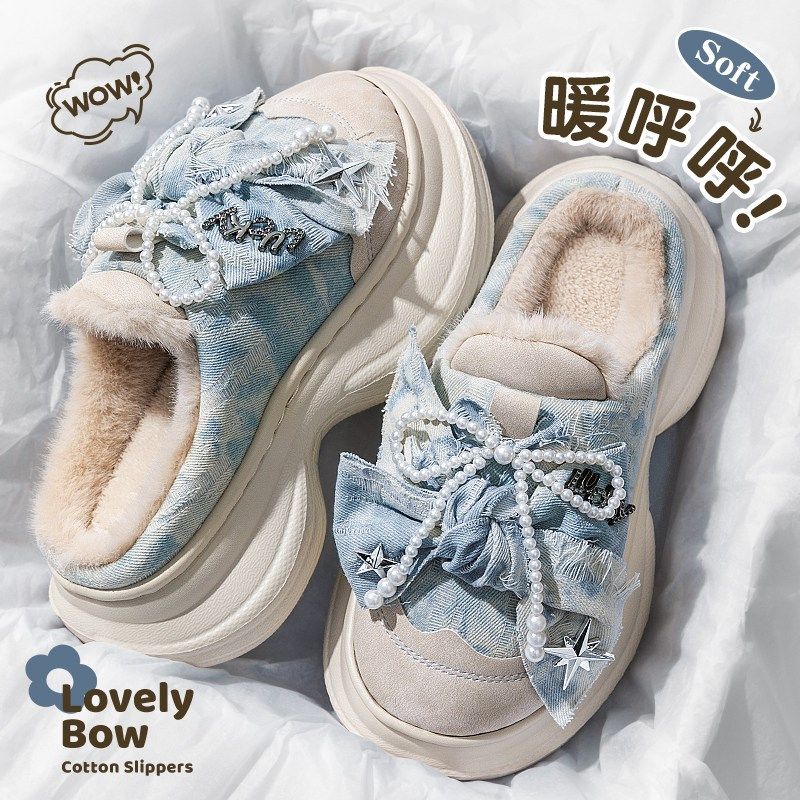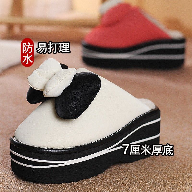 蝴蝶结厚底棉拖鞋女士2025新款秋冬季可外穿增高防滑保暖毛毛棉拖