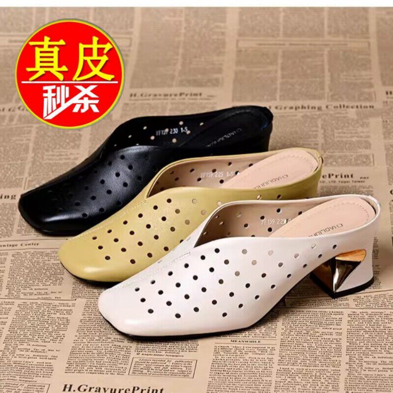 品牌真皮穆勒包头半拖鞋女士夏季外穿时尚百搭方头粗跟懒人凉拖鞋