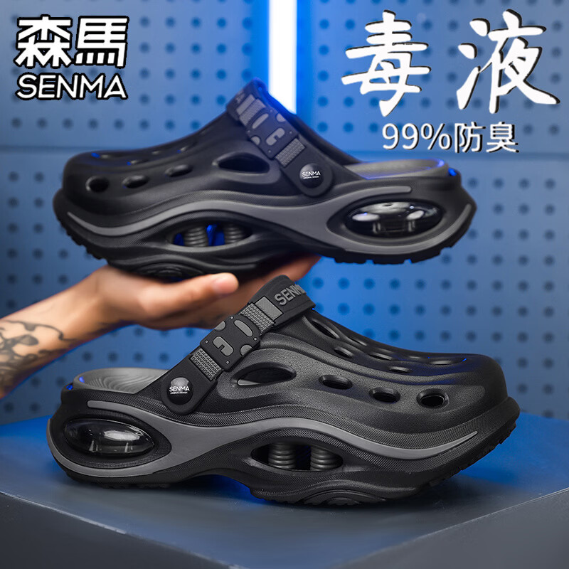 森馬运动拖鞋男夏季2026新款户外穿气垫厚底踩屎感洞洞鞋开车沙滩凉鞋 黑灰 42-43