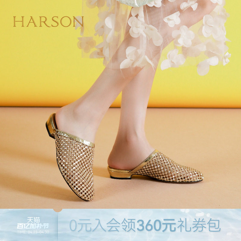 哈森镂空水钻外穿包头拖鞋女鞋金色闪耀夏季新品HWM250156