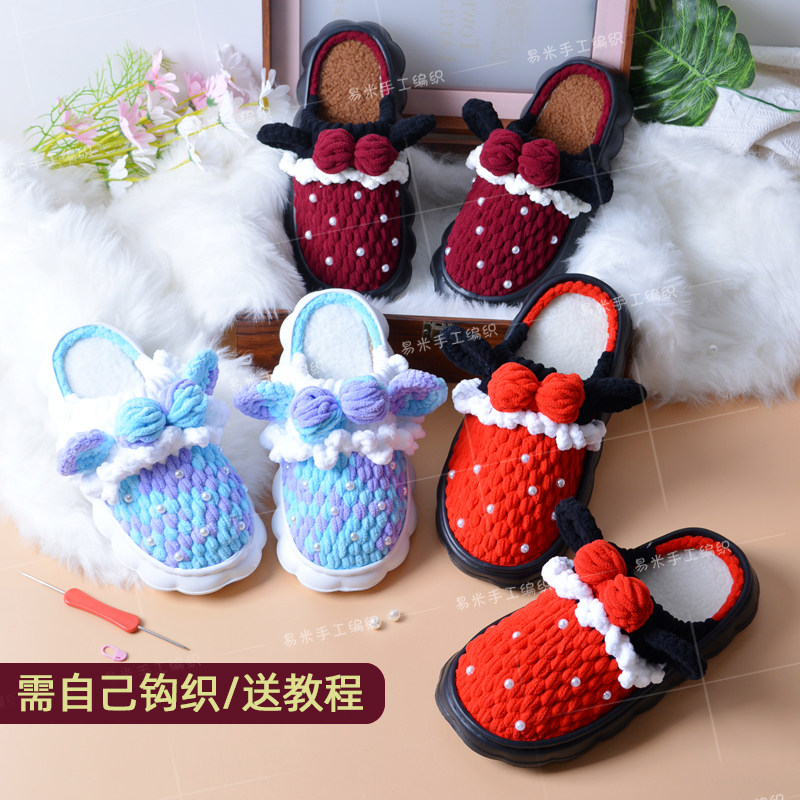 手工钩织秋冬米奇泡芙棉拖鞋加绒底冰条线钩居家亲子卡通鞋材料包