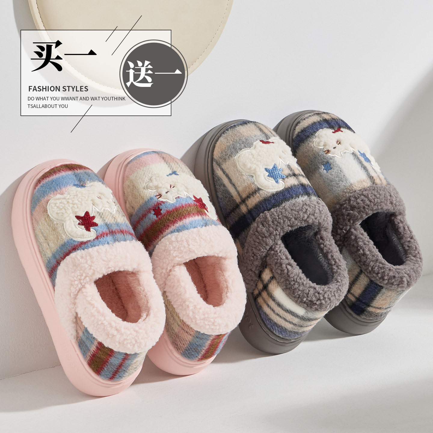 买一送一棉鞋女防滑冬季2026新款室内居家保暖情侣款毛绒拖鞋男士