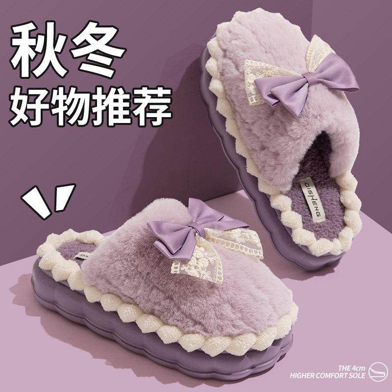 蝴蝶结棉拖鞋女士2025新款秋冬季室内居家甜美防滑保暖毛绒棉拖女