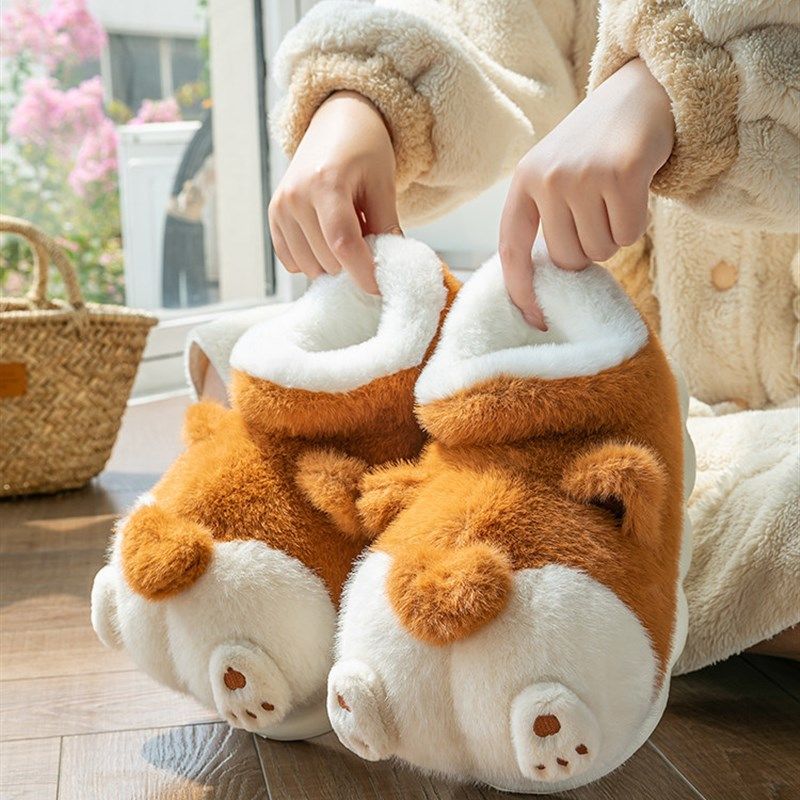DHWA柯基包跟棉拖鞋女款冬季室内家居卡通防滑高帮保暖加绒棉鞋萌