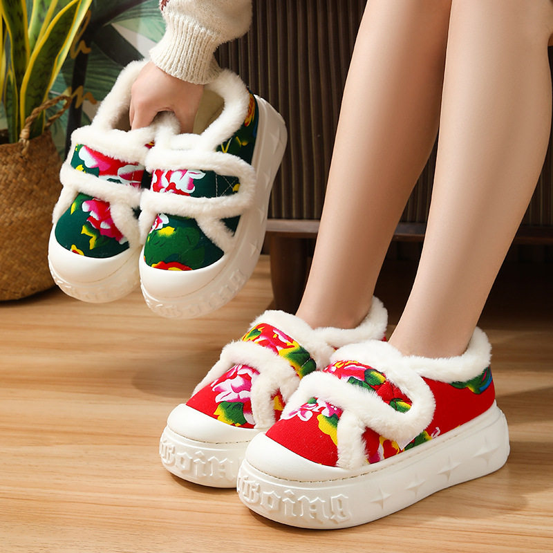 冬季加绒保暖棉鞋女款居家室内外穿防滑厚底棉拖鞋包跟大花保暖鞋